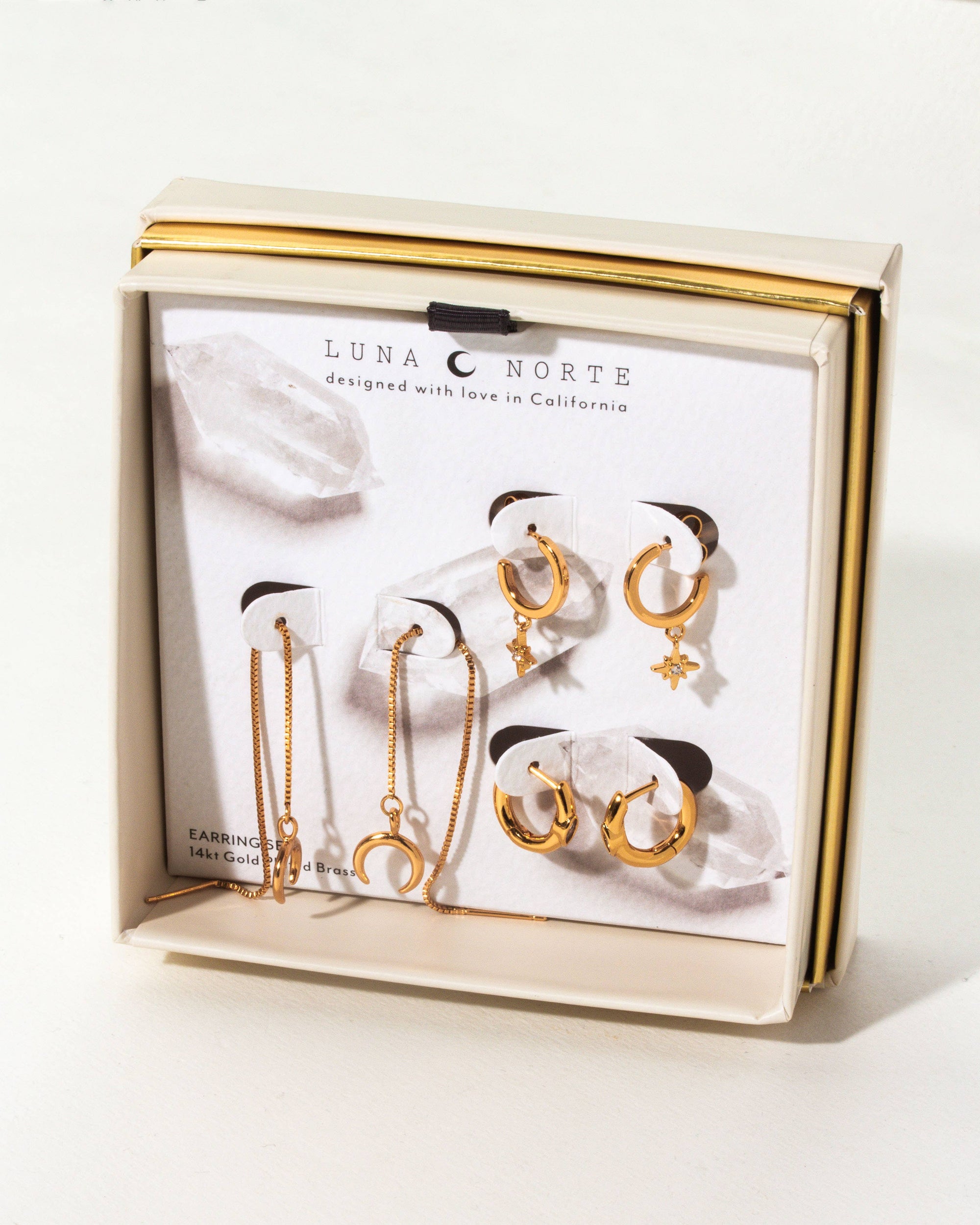 This celestial-themed set includes three distinct pairs of earrings - a huggie, a threader, and a drop charm post, each echoing the enchantment of the night sky. Designed for versatility, these earrings cater to all, from those with a single piercing to those with multiple, making them a seamless addition to any jewelry collection. Ideal for mixing, matching, or wearing solo, this set promises to bring a touch of stellar charm to any outfit. Offer your clients the joy of an earring party with this must-have set, perfect for anyone seeking to infuse their look with celestial elegance. Style details 14KT Gold plated Brass Threader length: approx. 3” Hoop sizes: approx. 0.5" diameter Comes boxed