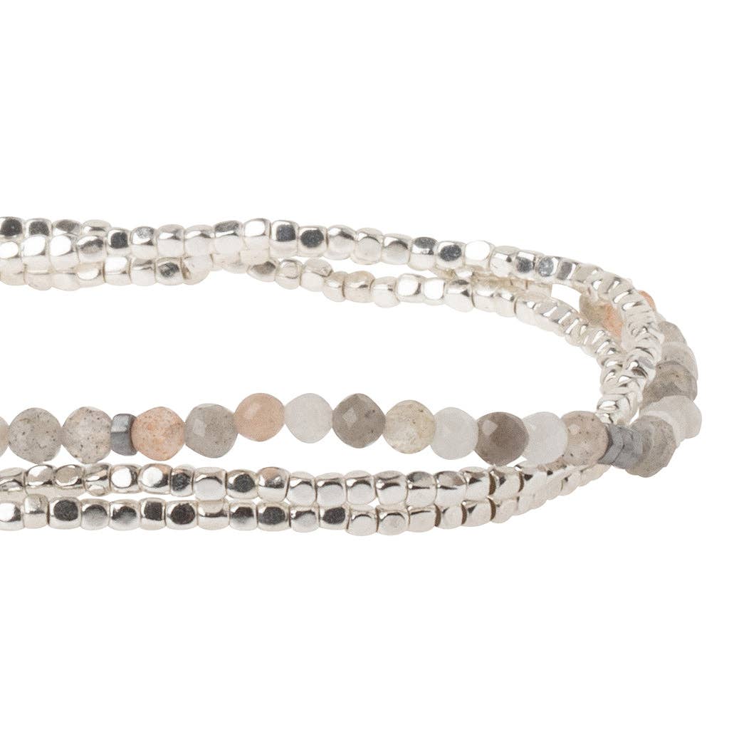 Bracelet becomes a necklace & Ta-Da! Faceted gemstones mix with tiny geometric metal beads to create a subtle and magical piece. Wraps as a bracelet 3 times or wear as a single strand necklace. • Materials: Semi precious gemstone beads, plated brass, stretch cord • Presented on cards that tell the meaning and properties of each stone. • Moonstone: Stone of Balance. Opening, Inspiring, Healing.