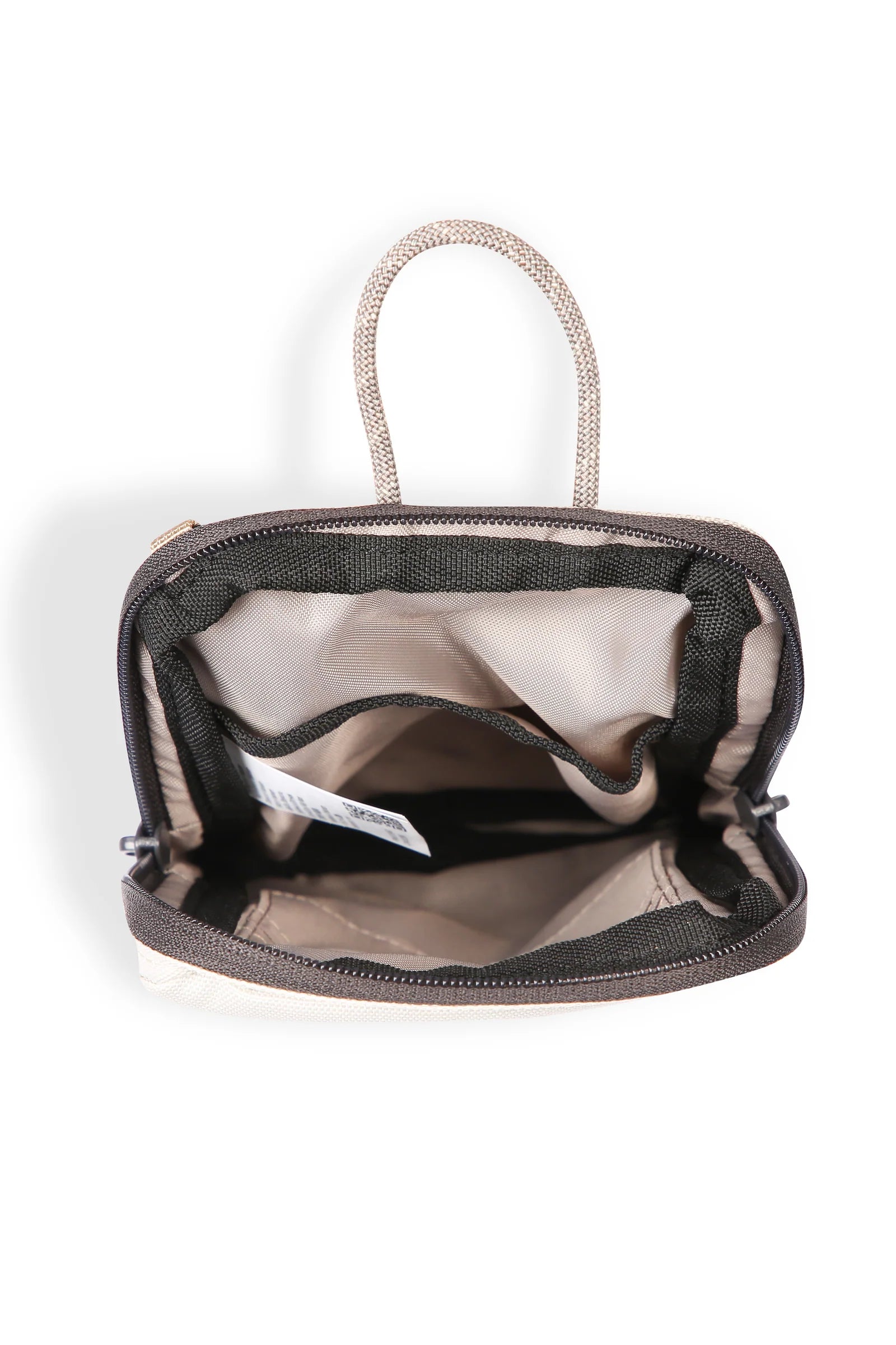 Cross body essential wallet case with fixed rope shoulder strap that can detach and can convert to belt bag, metal d-ring and spring hook hardware, fixed rope loop handle, one main compartment with zip closure, front stash pocket, internal pocket and multiple internal cash, card, ID slots.