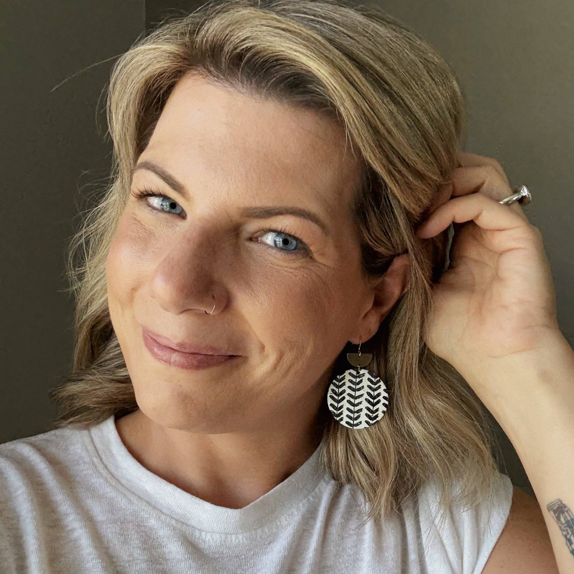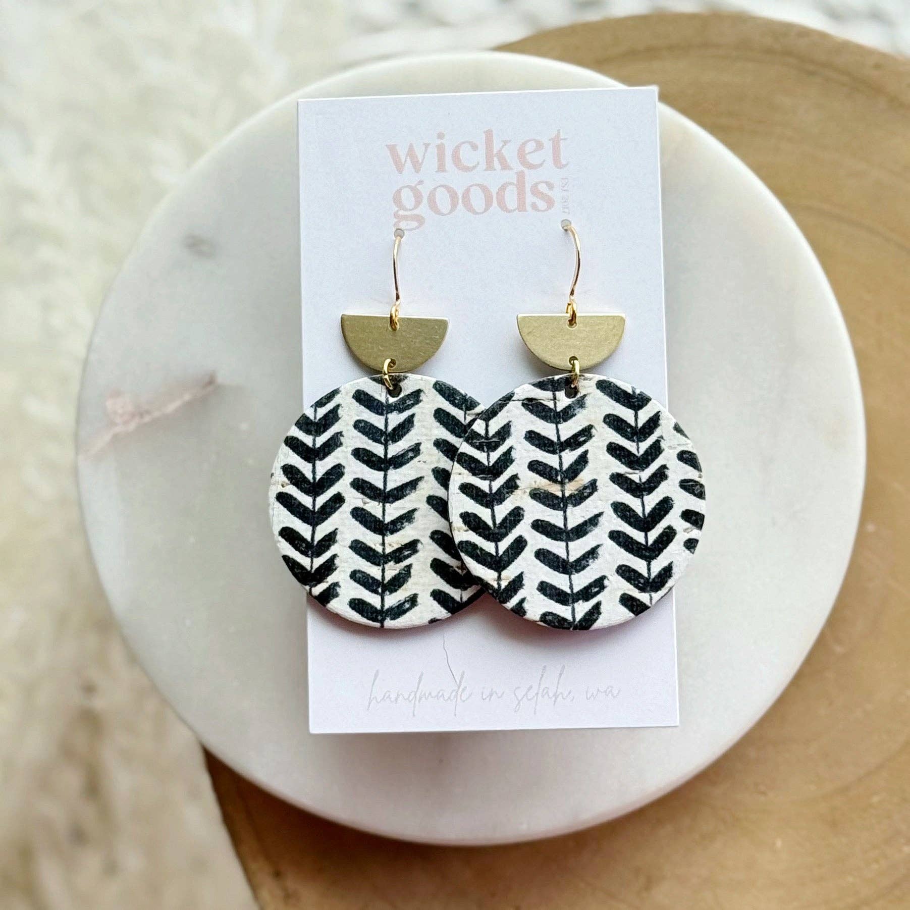 Bold + gold. Beautiful brass paired with leather rounds create a simple, bold statement. Approximate length 1 3/4”. Made from cork backed with genuine leather, raw brass, and hypoallergenic gold-plated brass ear wires. Designed and assembled in our home studio in Selah, Washington. Please note: Leather is unique and cut from different areas on each hide which will result in subtle variances in texture or print from piece to piece.