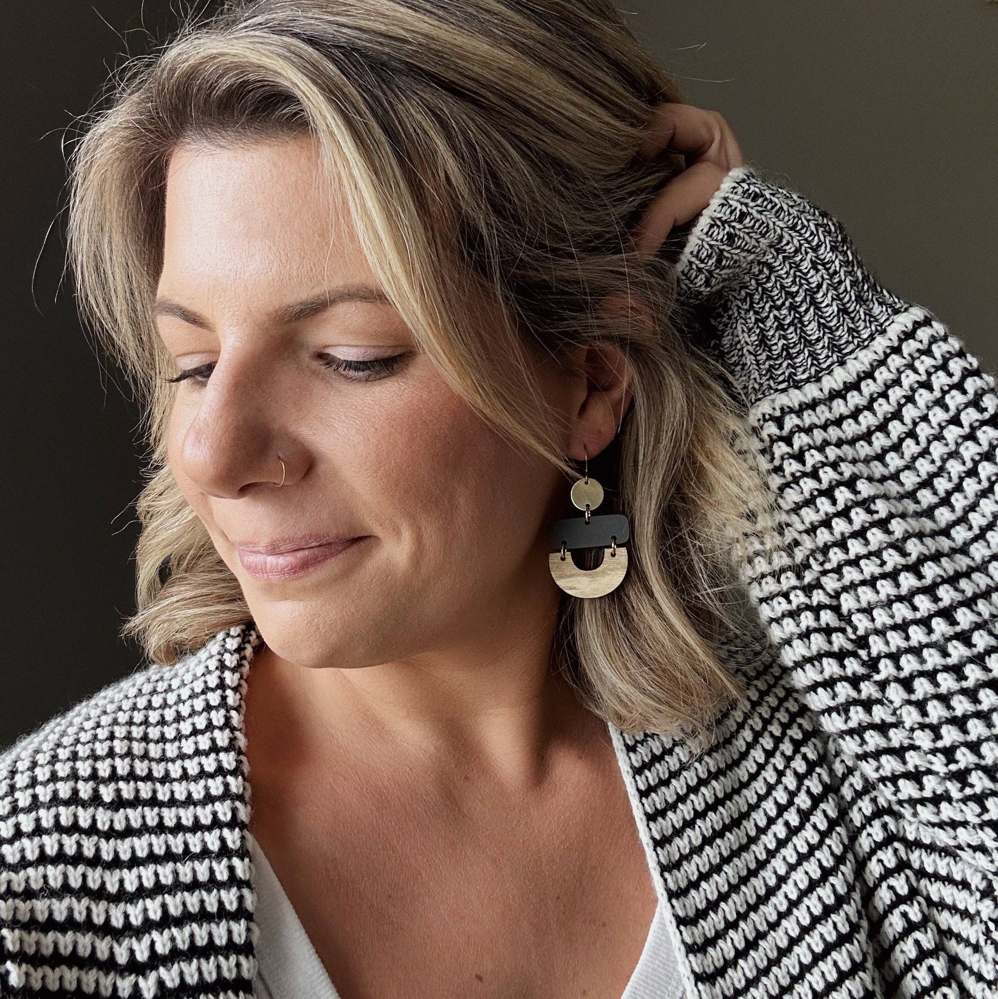 These drops are funky, fun, and lightweight. They’ll add the perfect pop of color to your favorite outfits and are perfect for elevating your everyday basics. Approximate length is 2”. Julie is wearing Zuma in Ash Made from hand-painted baltic birch and hypoallergenic gold-plated brass ear wires. Designed, cut, and assembled in our home studio in Selah, WA.