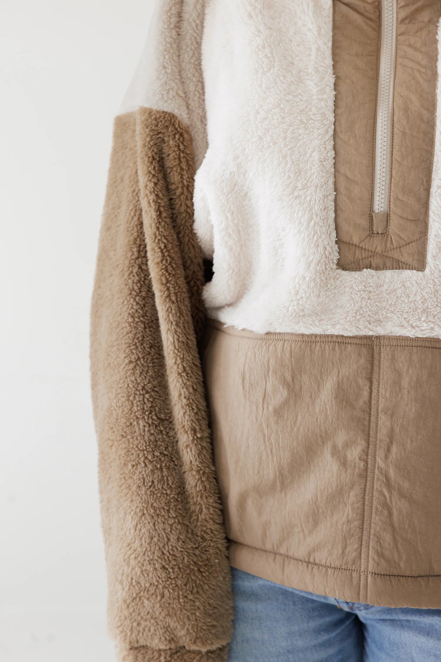 Relaxed fit, half zip mock neck fleece pullover, woven fabric overlay at placket, length hits at waist, drop shoulder silhouette, hand patch pocket with woven fabric overlay, elastic encased sleeve cuffs, slight curved hem.