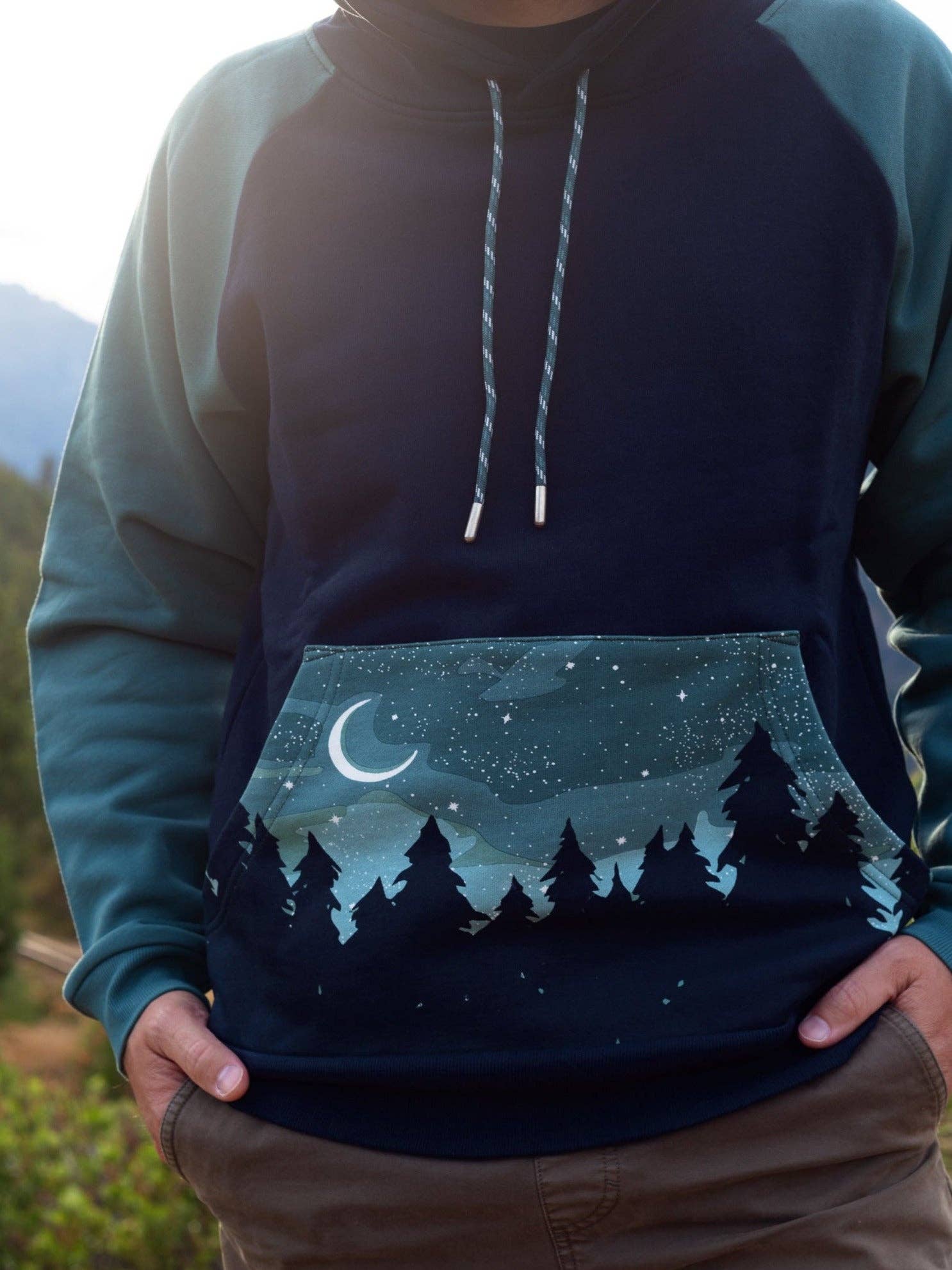The aurora borealis' dancing lights, imagined as swirling teals in the night sky. The bright, dynamic sky contrasts the dark blue treeline. Relaxed hoodie with oversized hood (fits over headphones!) and large, decorative front pocket.